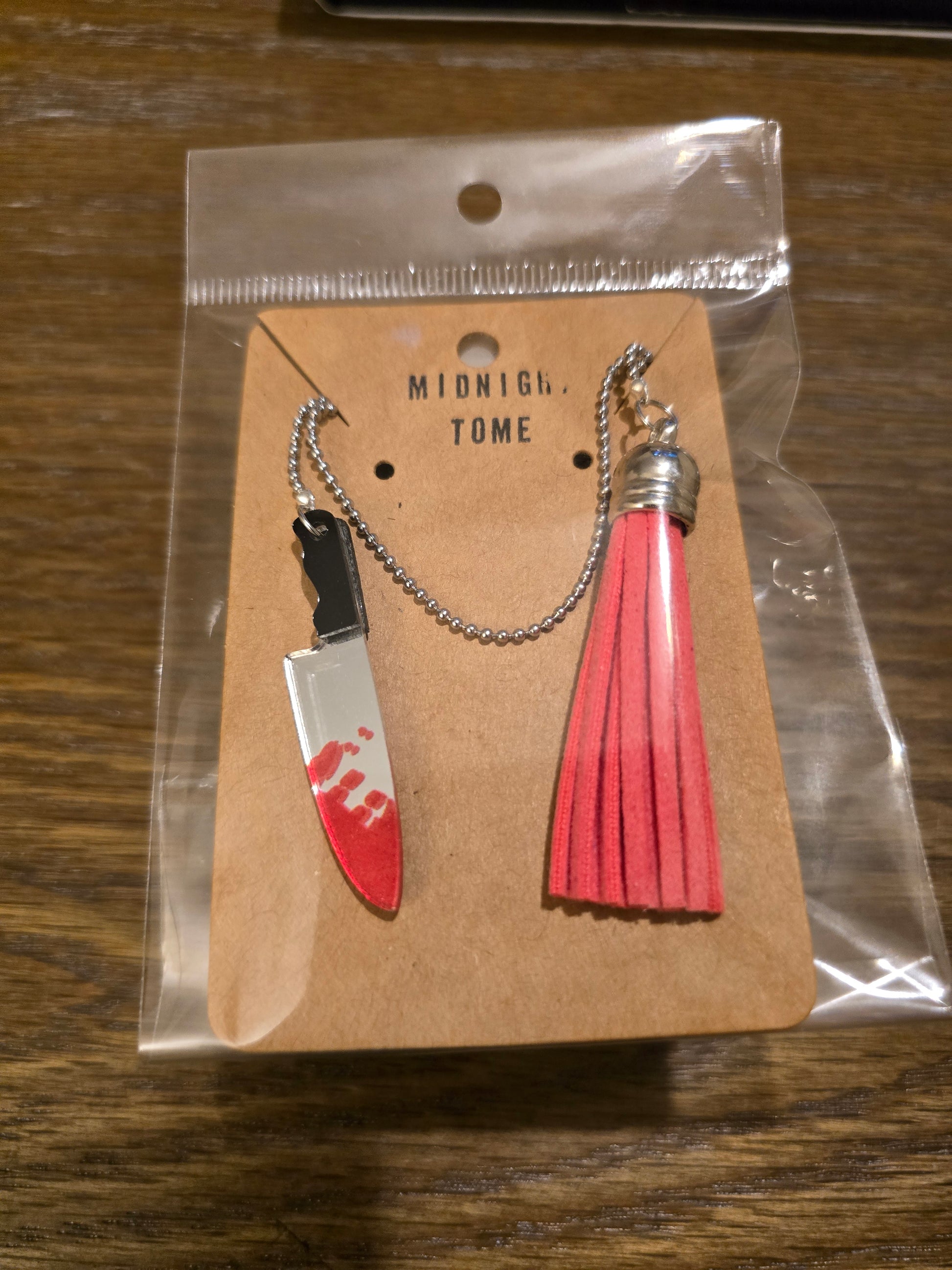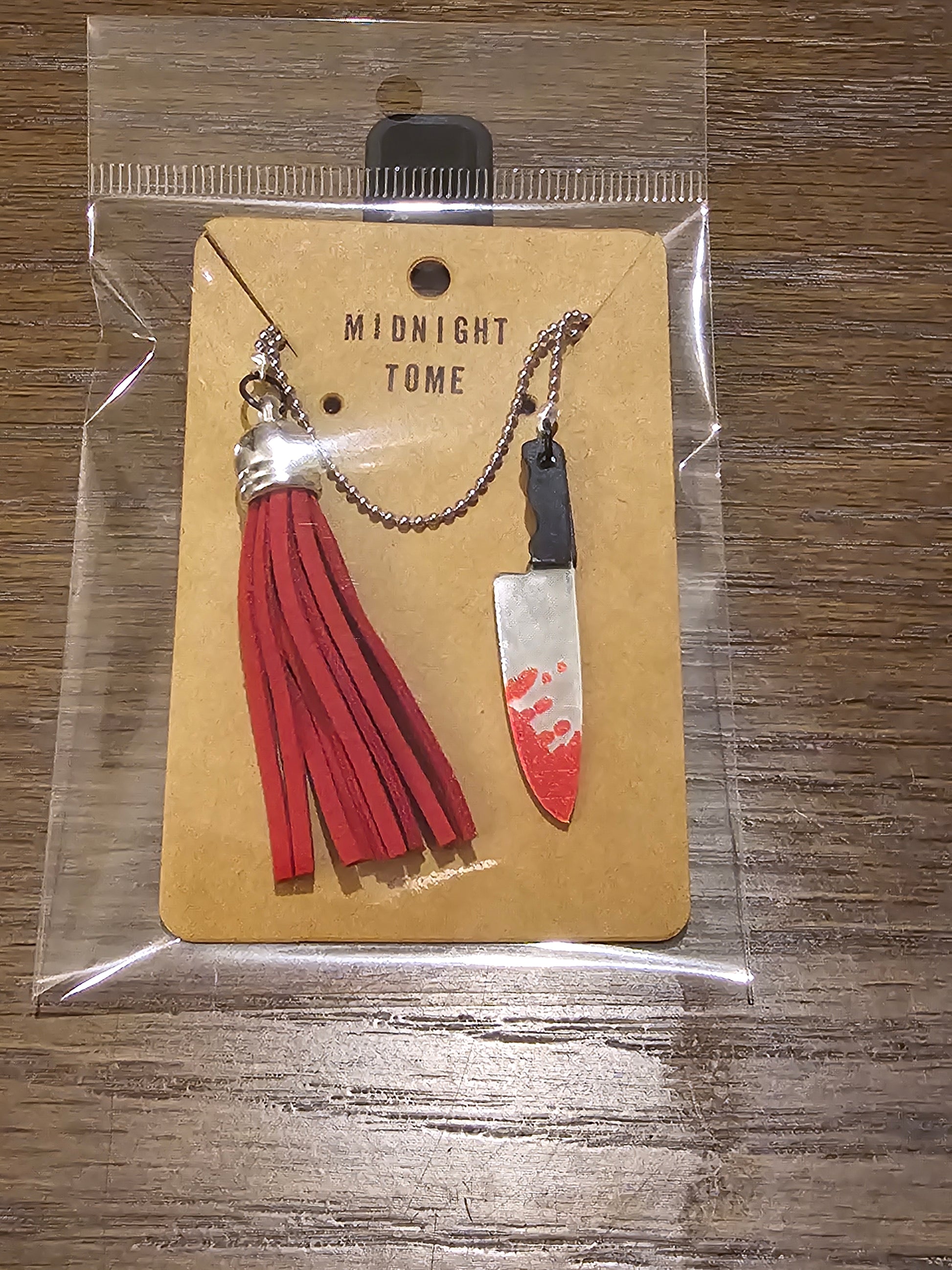 Blood red tassel with bloody carving knife charm